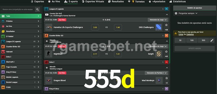 O 555d oferece uma grande seleção de opções de apostas em e-sports com probabilidades competitivas